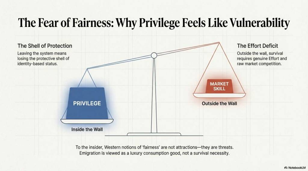 因此,在他们眼中,西方社会的“公平”与“低竞争”并非吸引力,反而是威胁。因为一旦置身于那样的体系,他们将失去特权保护壳,必须通过真实的努力(Effort)来换取生存。