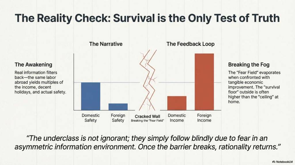 - 劳动价值的觉醒: 底层并非愚昧,他们只是在信息不对称中由于恐惧而盲从。一旦信息壁垒被打破,他们会迅速意识到,外部世界的“生存下限”,实际上远高于他们在国内拼尽全力维持的“天花板”。