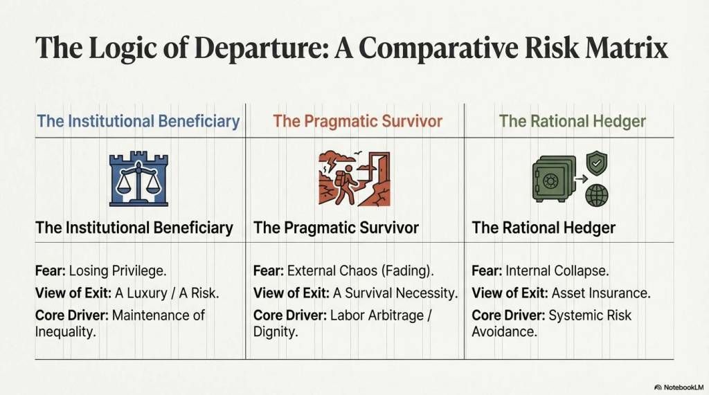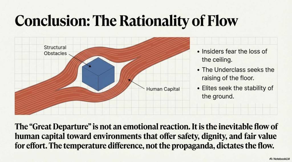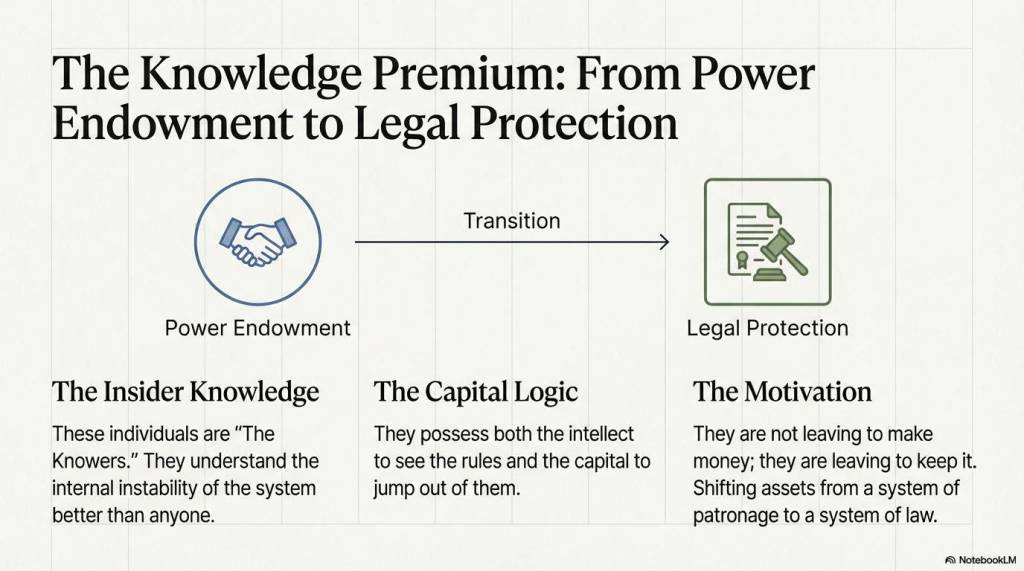 - 深层动机: 这些“知情者”深知体系的内生不稳定性。他们不仅拥有看清规则的智识,更拥有跳出规则的资本。他们的离开,是为了寻求真正的安全——一种不依赖于权力恩赐、受法律严格保护的财产安全。